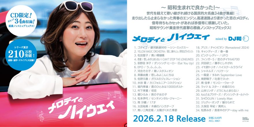 DJ和、累計210万枚を突破したミックスCDシリーズ最新作、70~80年代昭和サウンド黄金世代直撃の原曲ノンストップミックス「メロディとミッドナイト mixed by DJ和」「メロディとハイウェイ mixed by DJ和」が2026年2月18日に2作品同時発売!ジャケットには、昭和の名曲を愛してやまないお笑い芸人・友近が出演!